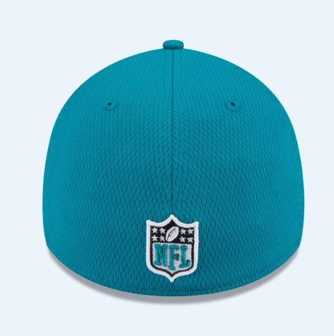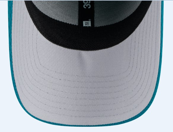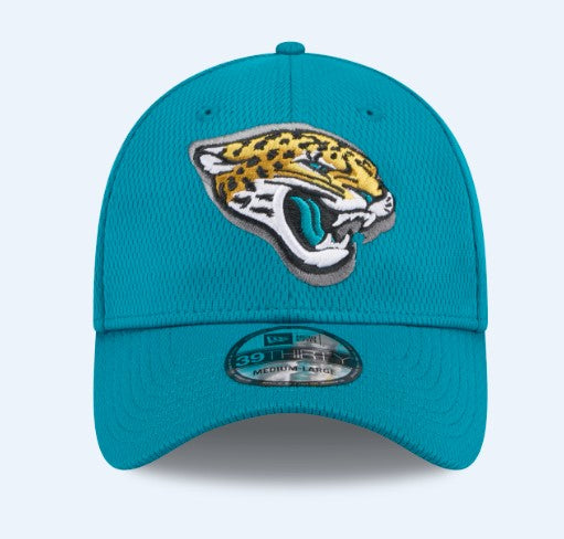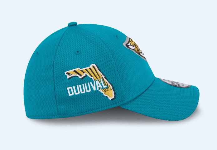 The Jacksonville Jaguars 2024Draft 39THIRTY Teal Stretch Fit Cap features an embroidered Jaguars wordmark and logo at the front panels, matching NFL Shield at the right-wear side, team logo at the rear, and a gray undervisor.