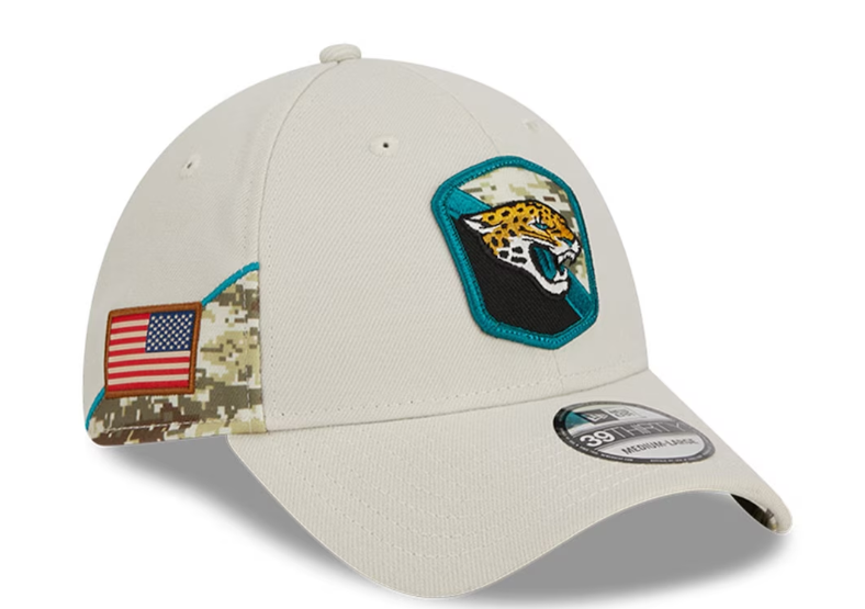 Honor our service members while supporting the Jacksonville Jaguars with this 2023 Salute To Service 39THIRTY Flex Hat. This New Era hat features an embroidered Jacksonville Jaguars logo at the front panels with a camo undervisor and the official NFL Salute to Service patch at the rear. The right-wear side displays an American Flag patch. The NFL does not profit from the sale of Salute to Service products.