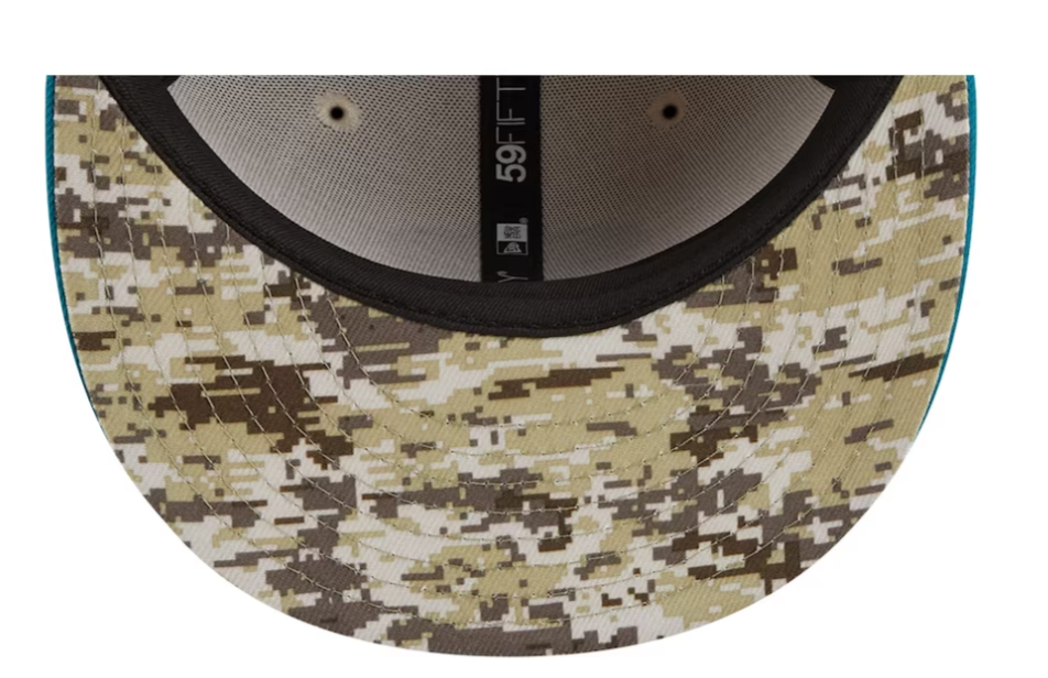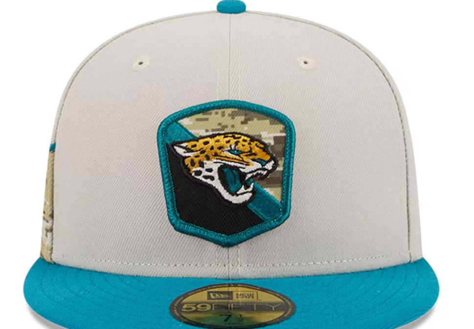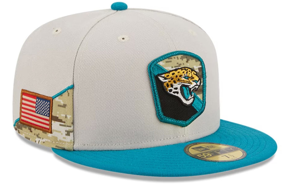 Honor our service members while supporting the Jacksonville Jaguars with this 2023 Salute To Service 59FIFTY Fitted Hat. This New Era hat features an embroidered Jacksonville Jaguars logo at the front panels with a camo undervisor and the official NFL Salute to Service patch at the rear. The right-wear side displays an American Flag patch. The NFL does not profit from the sale of Salute to Service products.
