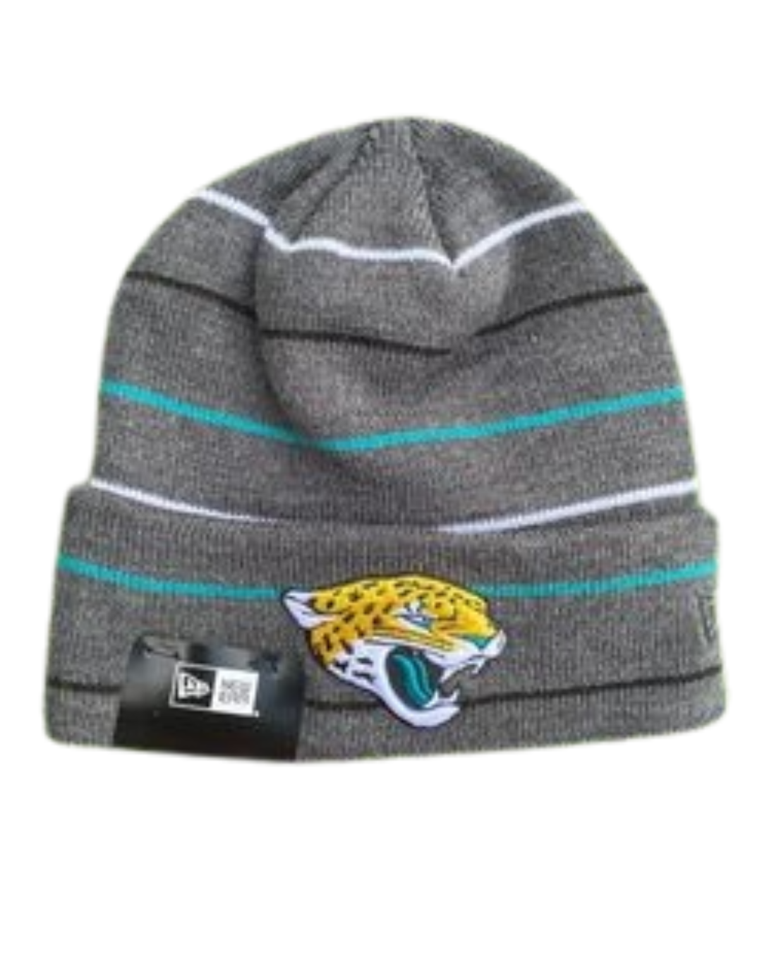 The Jacksonville Jaguars 2023 Cold Weather grey Knit features an embroidered Jaguars logo at the front with a new era logo including thin black, white, and teal stripes.